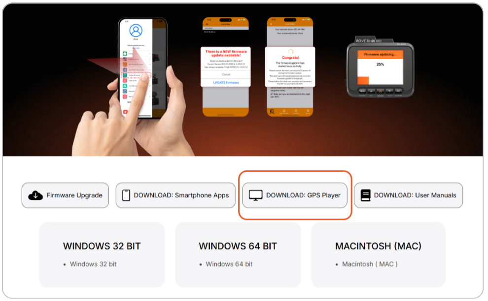 Head over to the official ROVE support page and download the most updated version of the GPS Player compatible with your operating system (Windows or macOS):