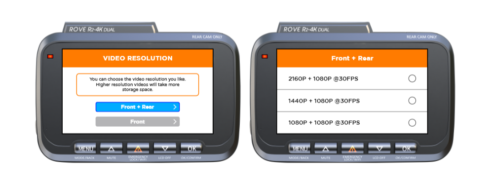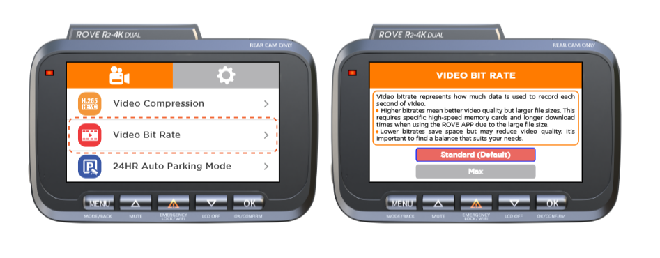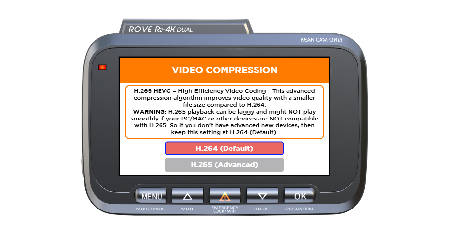 All ROVE dash cam models—including the R2-4K, R2-4K PRO, R2-4K Dual, R2-4K Dual PRO and R3 record video files in: MP4 format (H.264 or H.265 codec)